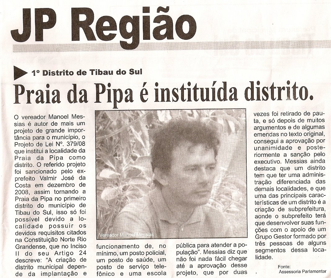 Enquanto vereador, o atual vice-prefeito Manoel Messias foi o autor de um projeto de grande relevância para o município: o Projeto de Lei Nº 379/08, que transformou a localidade da Praia da Pipa em distrito. O projeto foi sancionado pelo…
